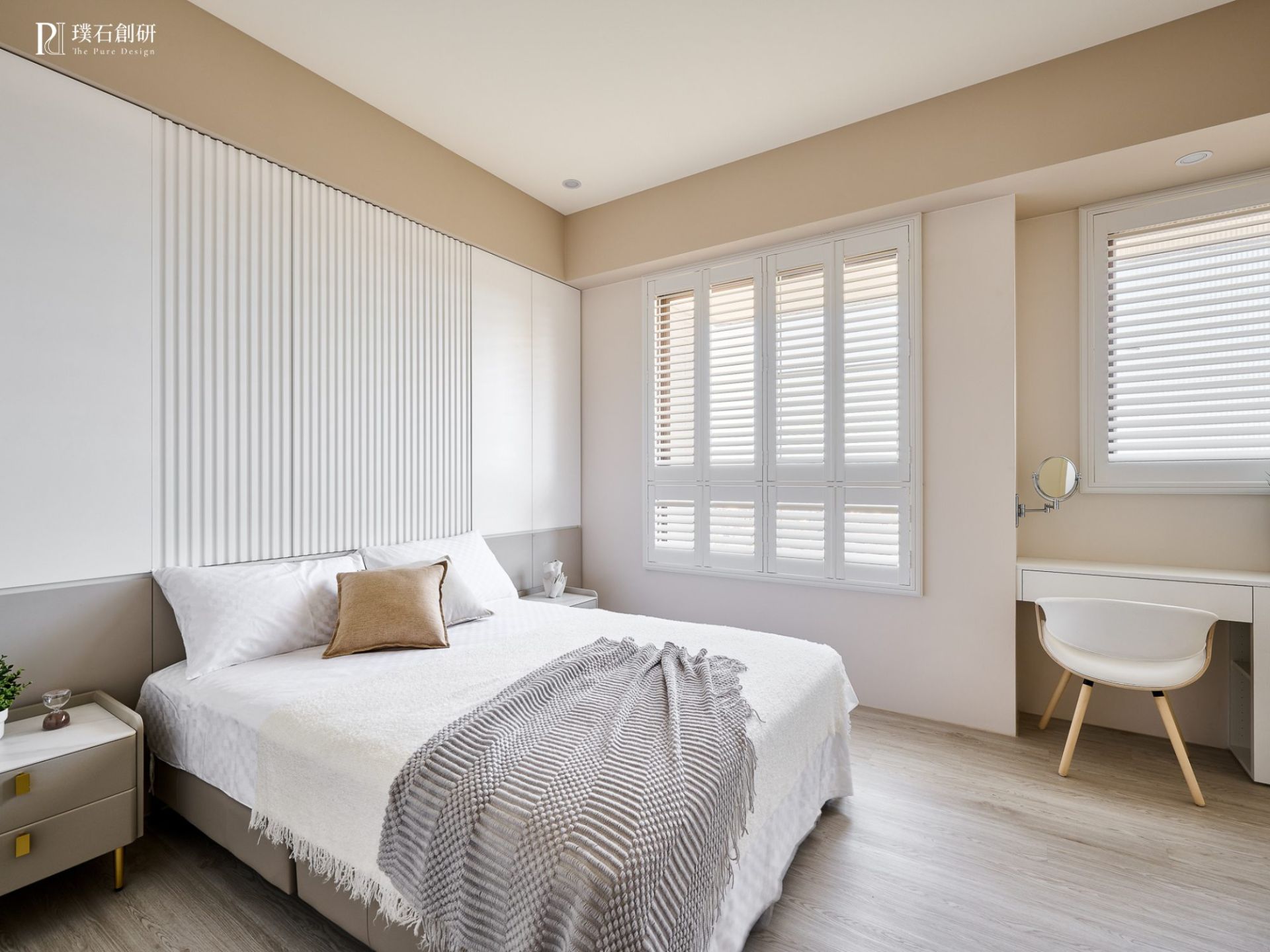 純淨灰白的設計,以精緻的線條勾勒出細節的質感,讓空間看似簡約卻不失品味。圓弧的門型設計巧妙地柔化了整體視覺效果,營造出溫暖舒適的氛圍,為空間增添了雅致的藝術氣息。