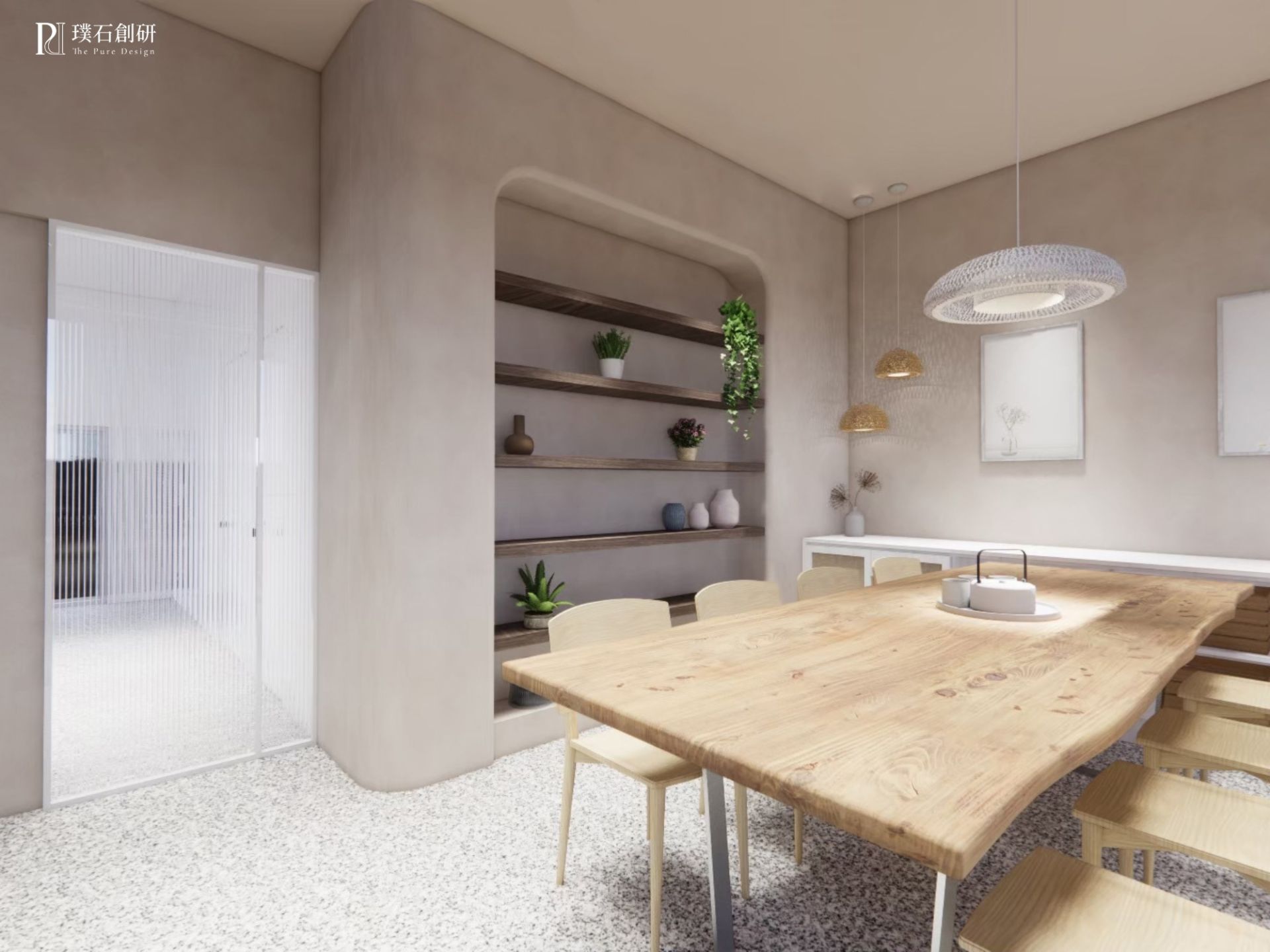 在這個專屬於味覺與心靈的烘焙屋,設計以純白為基調,點綴溫潤的木質與抿石子,並融合帶有貴氣的金屬質感,呈現出一種低調而不失奢華的氛圍。空間採用柔和的圓弧設計,讓每一處都散發著溫暖,猶如一抹晨光灑落心間,營造出既舒適又高貴雅致的用餐環境。