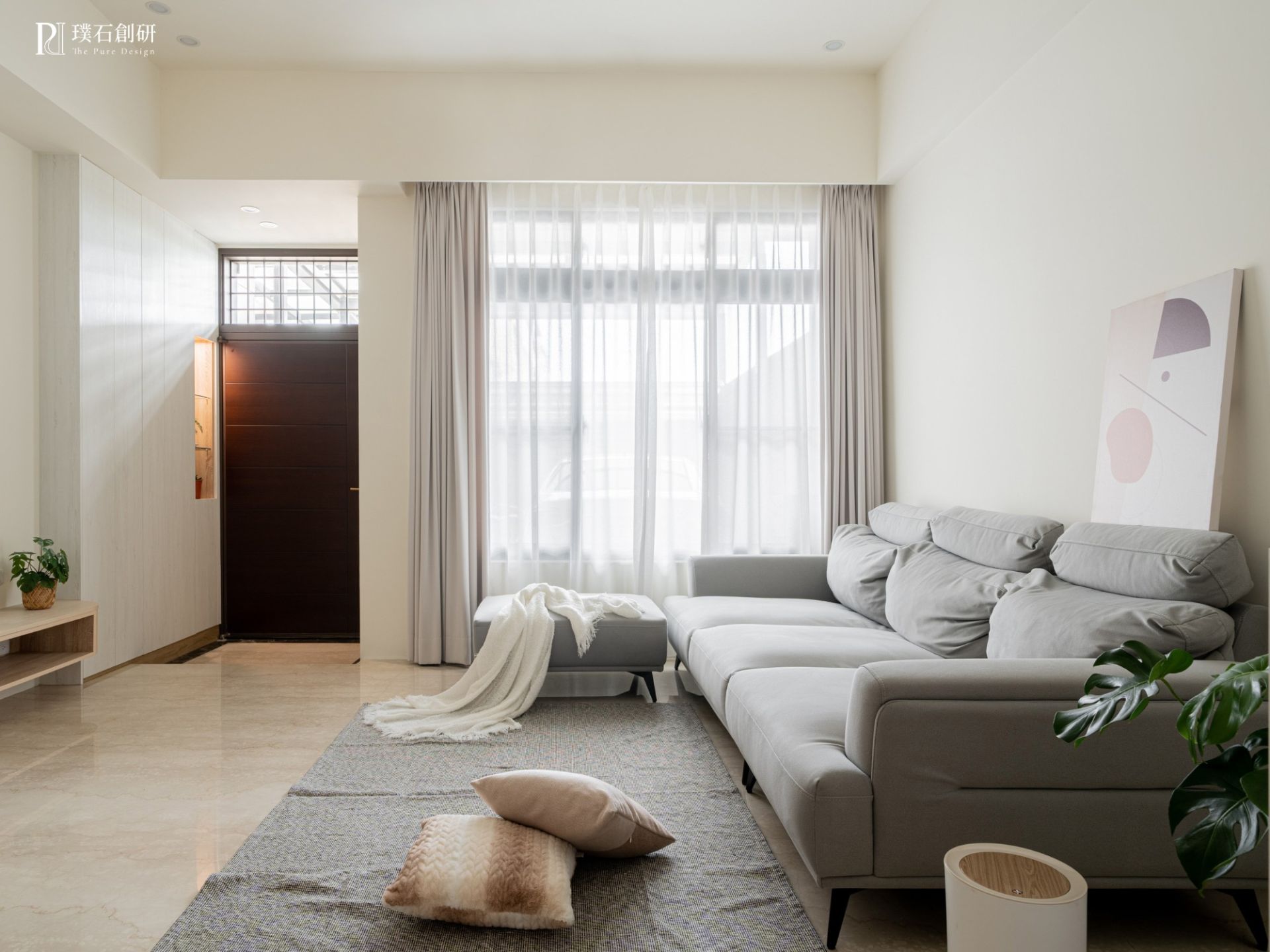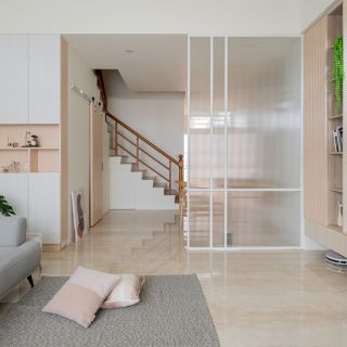 異材質的運用,凸顯了和諧又對比的設計美學。在開放式客廳中,巧妙地結合了平滑的石英磚地板和木頭紋路的層架收納,形成鮮明的材質對比。材質的碰撞不僅打造了視覺上的平衡美感,還為空間增添了豐富的層次感。